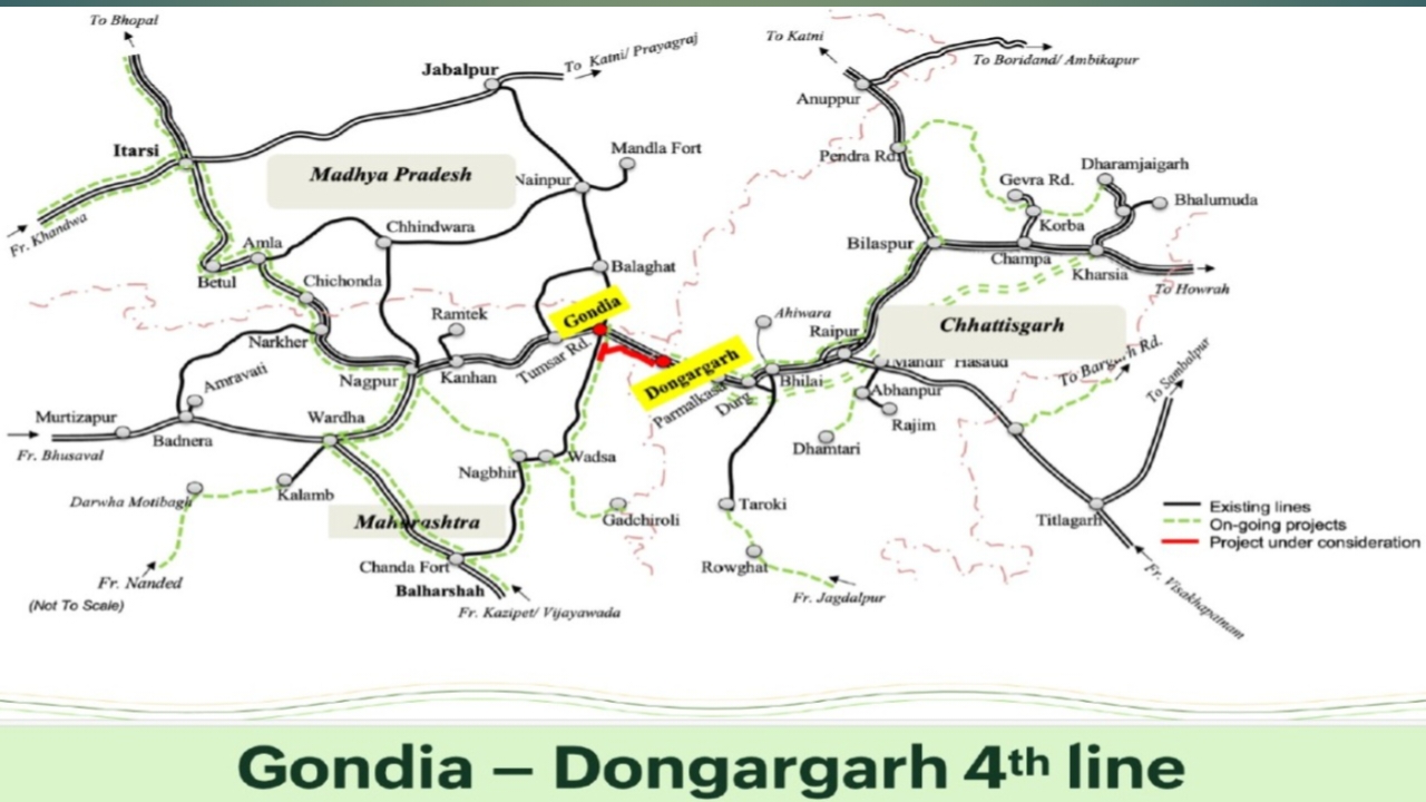 इनमें से एक परियोजना है — गोंदिया–डोंगरगढ़ चौथी रेल लाइन, जिसकी लंबाई 84 किलोमीटर और अनुमानित लागत ₹2,223 करोड़ है। यह लाइन महाराष्ट्र और छत्तीसगढ़ राज्यों से होकर गुजरेगी और देश के पूर्व, मध्य और पश्चिमी क्षेत्रों को जोड़ने वाले एक प्रमुख यात्री एवं माल यातायात मार्ग पर स्थित होगी।