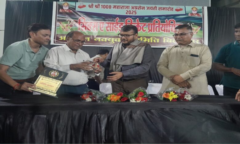 BILASPUR NEWS. अग्रवाल नवयुवक समिति द्वारा सिक्स ए साइड फ्लड लाइट क्रिकेट टूर्नामेंट आयोजित किया गया, जिसमें 24 टीमों ने हिस्सा लिया। मिनी स्टेडियम में हुए तीन-तीन ओवर के मैचों में युवाओं ने चौके-छक्कों की बरसात की। टूर्नामेंट का उद्घाटन मैच सुपर सिक्स और अग्र वॉरियर्स के बीच खेला गया, जिसमें सुपर सिक्स ने जीत दर्ज की। देर रात तक दर्शकों ने रोमांचक मुकाबलों का आनंद लिया।