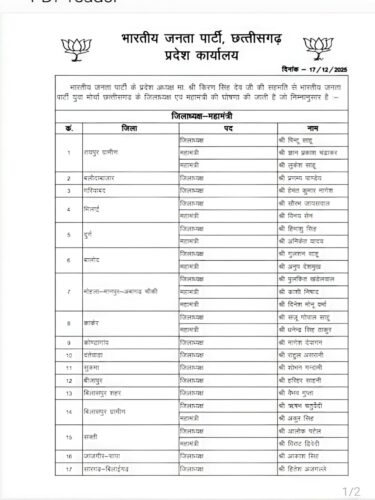 जारी सूची में बिलासपुर शहर जिला अध्यक्ष के रूप में वैभव गुप्ता को जिम्मेदारी सौंपी गई है, जबकि बिलासपुर ग्रामीण जिला अध्यक्ष का दायित्व ऋषभ चतुर्वेदी को मिला है। नियुक्तियों की घोषणा होते ही कार्यकर्ताओं में खासा उत्साह देखने को मिला।