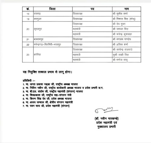 भारतीय जनता पार्टी के प्रदेश अध्यक्ष किरण सिंहदेव की सहमति से भारतीय जनता युवा मोर्चा (भाजयुमो) ने संगठन को मजबूत करने की दिशा में बड़ा कदम उठाया है। भाजयुमो के प्रदेश अध्यक्ष ने प्रदेश के 23 जिला अध्यक्षों के नामों की घोषणा कर दी है।