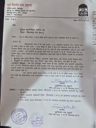 पार्षद सूर्यकिशोर राज ने मांग की है कि पुलिस प्रशासन इन चिन्हित क्षेत्रों में गश्त बढ़ाए और अवैध शराब-गांजा बेचने वालों पर कड़ी कार्यवाही करे। इस पत्र की प्रतिलिपि पुलिस अधीक्षक (SP) बिलासपुर, जिला आबकारी अधिकारी और तोरवा थाना प्रभारी को भी भेजी गई है ताकि संयुक्त रूप से कार्रवाई कर वार्ड को नशा मुक्त और सुरक्षित बनाया जा सके।