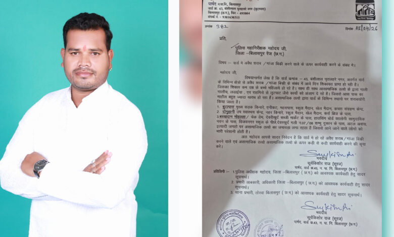 बिलासपुर नगर पालिक निगम के वार्ड क्रमांक 43 (बंशीलाल धृतलहरे नगर, बुटापारा) में बढ़ते अवैध नशाखोरी और असामाजिक तत्वों के आतंक के खिलाफ स्थानीय पार्षद सूर्यकिशोर राज (सूरज) ने कड़ा रुख अपनाया है। पार्षद ने पुलिस महानिरीक्षक (IG), बिलासपुर रेंज को पत्र लिखकर वार्ड के विभिन्न क्षेत्रों में बिक रही अवैध शराब और गांजा पर तत्काल रोक लगाने तथा दोषियों पर सख्त कार्रवाई करने की मांग की है।
