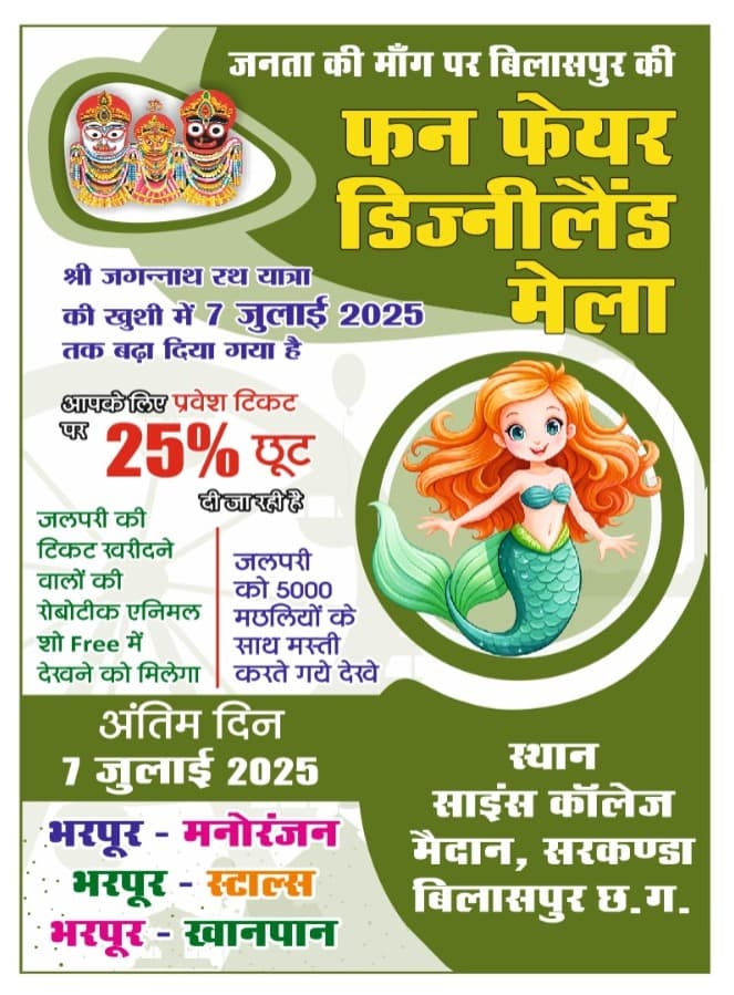 Disneyland Fair Bilaspur:भगवान जगन्नाथ रथ यात्रा की खुशी में डिजनीलैंड मेले में छूट और विस्तार एंट्री टिकट पर 25% की छूट, अब 7 जुलाई तक चलेगा मेला