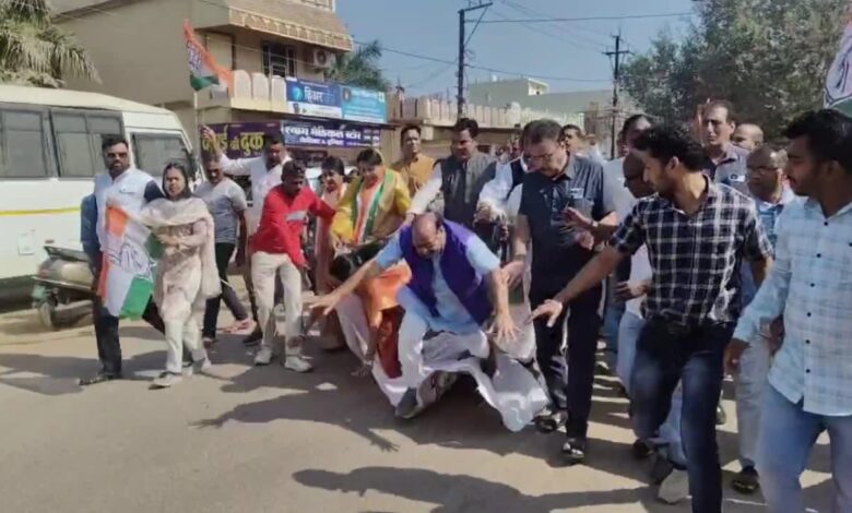 Dhamtari News. धमतरी में कांग्रेस का जोरदार प्रदर्शन; बीजेपी कार्यालय घेराव के दौरान सड़क पर गिरे विधायक और पूर्व विधायक, VIDEO वायरल