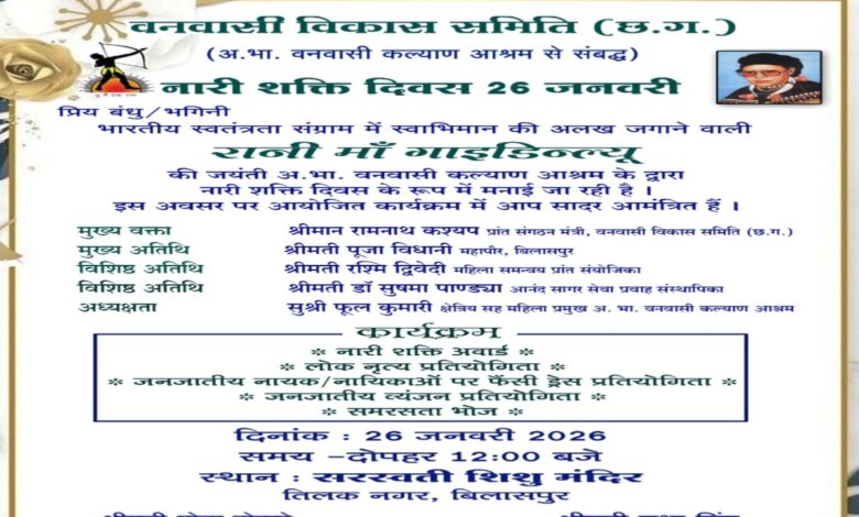 BILASPUR NEWS. वनवासी विकास समिति (छत्तीसगढ़) एवं अखिल भारतीय वनवासी कल्याण आश्रम की योजना से 26 जनवरी 2026 को नारी शक्ति दिवस का भव्य आयोजन किया जाएगा। यह कार्यक्रम वीरांगना रानी माँ गाइदिन्ल्यू की जयंती के उपलक्ष्य में आयोजित होगा। आयोजन दोपहर 12 बजे से सरस्वती शिशु मंदिर, तिलक नगर, बिलासपुर में संपन्न होगा।
