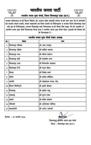 भारतीय जनता पार्टी के सांगठनिक ढांचे को मजबूती प्रदान करते हुए भारतीय जनता युवा मोर्चा (भाजयुमो) ने बिलासपुर जिले के लिए अपने मंडल अध्यक्षों की बहुप्रतीक्षित सूची जारी कर दी है। युवा मोर्चा के जिलाध्यक्ष वैभव गुप्ता ने वरिष्ठ नेतृत्व की सहमति के बाद बिलासपुर शहर के 15 विभिन्न मंडलों के लिए अध्यक्षों के नामों का आधिकारिक ऐलान किया है।