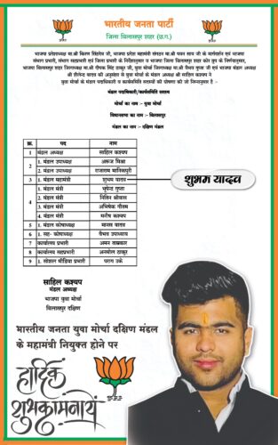 इसी क्रम में भारतीय जनता युवा मोर्चा दक्षिण मंडल के महामंत्री पद पर शुभम यादव की नियुक्ति की गई है। यह नियुक्ति उनके सक्रिय संगठनात्मक योगदान, युवाओं के बीच मजबूत पकड़ और पार्टी की विचारधारा के प्रति समर्पण को ध्यान में रखते हुए की गई है। शुभम यादव पूर्व में भी विभिन्न कार्यक्रमों एवं अभियानों में महत्वपूर्ण भूमिका निभाते रहे हैं और संगठन को जमीनी स्तर पर सशक्त बनाने में सक्रिय रहे हैं।
