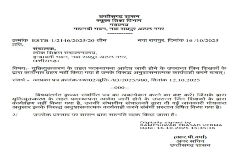 RAIPUR NEWS. छत्तीसगढ़ स्कूल शिक्षा विभाग ने युक्तियुक्तकरण के बाद भी स्कूल ज्वॉइन नहीं करने वाले शिक्षकों पर अब सख्त रवैया अपनाया है। विभाग ने ऐसे शिक्षकों के खिलाफ अनुशासनात्मक कार्रवाई का आदेश जारी कर दिया है। डायरेक्टर स्कूल शिक्षा ऋतुराज रघुवंशी ने सभी जिला शिक्षा अधिकारियों को पत्र लिखकर दो टूक निर्देश दिए हैं कि जो शिक्षक दो कार्य दिवस में अपने नए पदस्थापना स्थल पर ज्वॉइन नहीं करेंगे, उनके खिलाफ छत्तीसगढ़ सिविल सेवा (आचरण) नियम 1965 के तहत सख्त कार्रवाई की जाएगी।