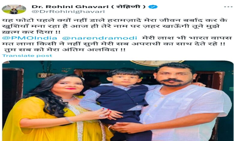 मध्यप्रदेश के इंदौर की रहने वाली पीएचडी स्कॉलर रोहिणी ने बुधवार को सोशल मीडिया पर लिखा— “आप सब को मेरा अंतिम अलविदा, आज ही तेरे नाम का जहर खाऊंगी, मेरी लाश भारत मत लाना।” इसके साथ ही उन्होंने प्रधानमंत्री नरेंद्र मोदी और पीएमओ को टैग करते हुए न्याय की गुहार लगाई।